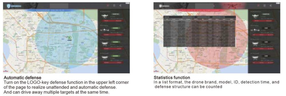 For inntrengende droner kan du velge: En-tast automatisk forsvar: Etter at systemforsvarsfunksjonen er aktivert, vil inntrengningsdronen automatisk forsvares av systemet uten personell på vakt; Manuell intervensjon: Du kan manuelt velge å forsvare enhver drone, og hvordan Time-forsvar, eller avbryte forsvar, og du kan velge å lokalisere piloten.